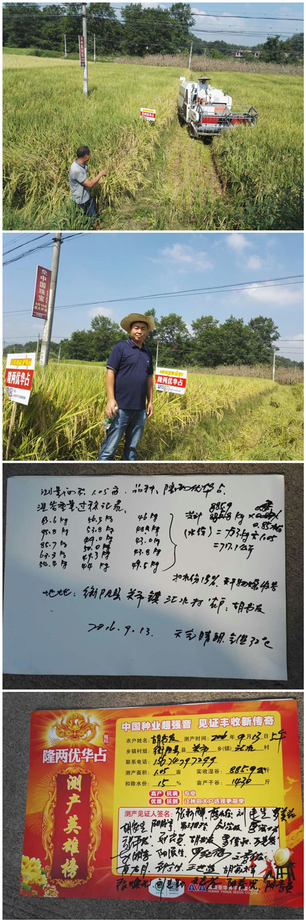 隆兩優(yōu)華占在衡陽(yáng)連續(xù)推廣兩年來(lái),各方面表現(xiàn)得到種植戶的信賴,在2016年各鄉(xiāng)鎮(zhèn)農(nóng)戶收割匯報(bào)上來(lái)的產(chǎn)量均十分理想。衡陽(yáng)縣隆兩優(yōu)華占代理商王總組織30位核心鄉(xiāng)鎮(zhèn)零售商及大戶來(lái)關(guān)市鄉(xiāng)進(jìn)行現(xiàn)場(chǎng)觀摩測(cè)產(chǎn),用田間表現(xiàn)證明品種的抗性強(qiáng),用數(shù)據(jù)來(lái)證明品種的高產(chǎn)穩(wěn)產(chǎn)。