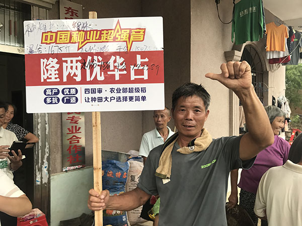2017年8月23日,東安各鄉(xiāng)鎮(zhèn)零售商及種植大戶集聚東安井頭圩鎮(zhèn),觀摩張老板種植的500畝連片隆兩優(yōu)華占。
