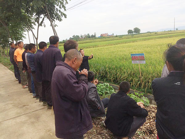 2017年9月10日,來(lái)自洋梓鎮(zhèn)各村的50余名農(nóng)戶在洋梓鎮(zhèn)曹老板的大地豐歌農(nóng)資店參加代理商盧總及曹老板共同舉辦的晶兩優(yōu)1988的觀摩訂購(gòu)會(huì)。