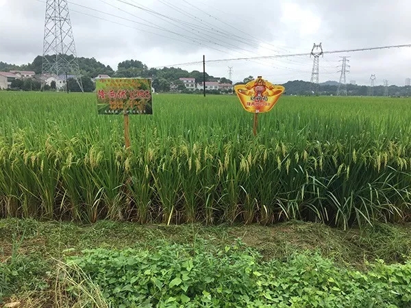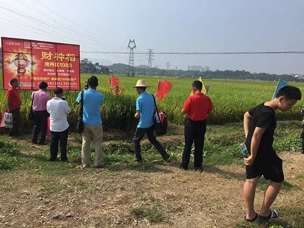 上午9時(shí)許,一行50多人從酒店出發(fā)前往北盛鎮(zhèn)隆兩優(yōu)1988觀摩會現(xiàn)場,田間立著財(cái)神稻的展示噴繪,財(cái)神客戶們紛紛駐足拍照留影,有的還下到田里看穗子、數(shù)分蘗,仔細(xì)查看品種表現(xiàn)。觀摩田塊為5月18日播種,瀏陽區(qū)域大部分農(nóng)戶都是選擇一晚種植,集中在5月中下旬播種,剛好遭遇了高溫高濕的天氣,隆兩優(yōu)1988在今年特殊年份所表現(xiàn)出的超高結(jié)實(shí)率、稻瘟病抗性、分蘗能力得到在場所有人的一致好評。