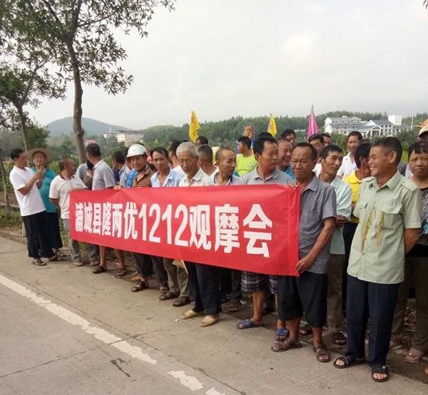 2017年9月25日,隆王稻在蒲城縣迎來(lái)了第三次觀摩會(huì)議,在代理商蒲城縣仙樓種子經(jīng)營(yíng)部周建勇以及石陂鎮(zhèn)經(jīng)銷(xiāo)商老葉的組織下,邀請(qǐng)了當(dāng)?shù)?0多位農(nóng)戶來(lái)到石坡鎮(zhèn)橋亭村開(kāi)展隆王稻觀摩會(huì)議。