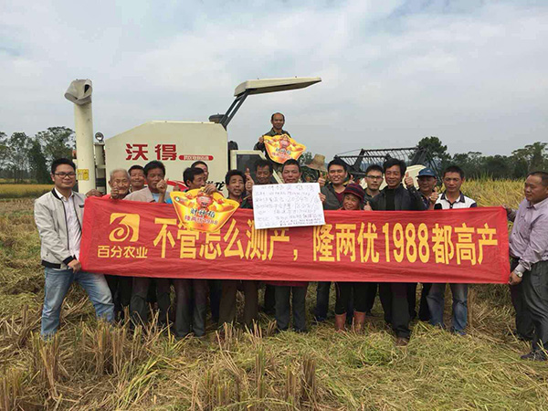 早上8點(diǎn)30分,田間地頭就聚集了幾十號人,現(xiàn)場熱鬧非凡,大家興致頗高!原來,前段時間雨水非常多,80%的品種都有倒伏現(xiàn)象,財神稻依然巋然不動,表現(xiàn)出極高的品種優(yōu)異性。現(xiàn)場大家看到財神稻穗大粒多,產(chǎn)量肯定不低,在區(qū)域負(fù)責(zé)人賴經(jīng)理給大家簡單講解品種特性期間,大家就迫不及待地預(yù)測這塊田的畝產(chǎn)量,有的說1400斤,有的說1600斤,而經(jīng)驗豐富的楊總卻估產(chǎn)1800斤!在場的所有人都不相信!眼見為實(shí),讓數(shù)據(jù)說話,大家趕緊讓收割機(jī)登場,轟隆隆的聲音仿佛在述說著豐收的喜悅,一會兒功夫,收割完畢,大家熱火朝天的幫忙稱量,最后的數(shù)據(jù)出乎大家意料,竟然畝產(chǎn)干谷1830斤,真是名副其實(shí)的財神稻!