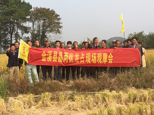 2017年11月4日,在金溪縣黃總的帶領(lǐng)下,全縣經(jīng)銷商一起來到金溪縣雙唐鎮(zhèn)古圩村參觀晶系明珠——晶兩優(yōu)龍占的田間表現(xiàn)。