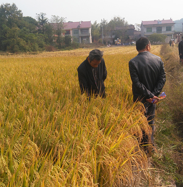 剛到田間,經(jīng)銷商朋友們就對晶兩優(yōu)龍占緊湊的株葉形態(tài)表示欣賞,一層層稻穗也為晶兩優(yōu)龍占的產(chǎn)量提供了堅實的保障。為了深入了解這個品種,有些人親自到田中查看起莖稈的抗倒性、抗病性,沒有發(fā)現(xiàn)一處病斑。也有朋友表示了對結(jié)實率、米質(zhì)的關(guān)心,經(jīng)查驗,晶兩優(yōu)龍占起碼有85%以上的結(jié)實率。最后,晶兩優(yōu)龍占以優(yōu)異的全面表現(xiàn)獲得了與會人員的一致好評。