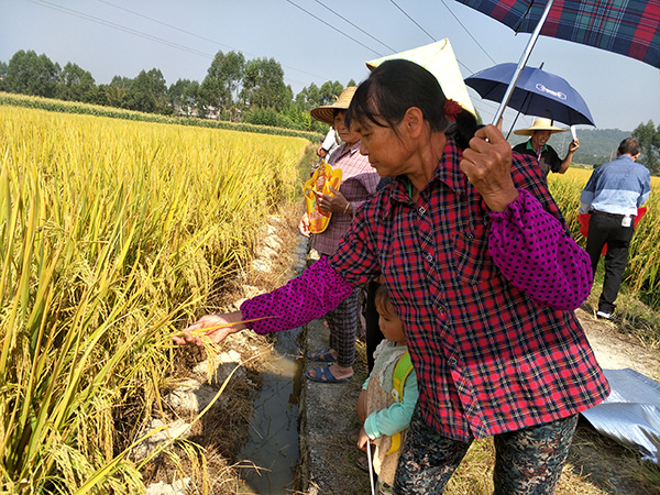 此次觀摩的位置在校椅鎮(zhèn)六蘭村,圍繞田邊種著瓜果,前后有四塊不同位置的隆兩優(yōu)1988,大家對(duì)種植水平、管理到位等問(wèn)題紛紛發(fā)表意見(jiàn)。今年沒(méi)有種的鄉(xiāng)民都在問(wèn)明年什么時(shí)候有種子賣,看著很不錯(cuò)的收成,一看就穩(wěn)產(chǎn),也沒(méi)有病害。零售商對(duì)品種也表示滿意,堅(jiān)定了明年的銷售信心。