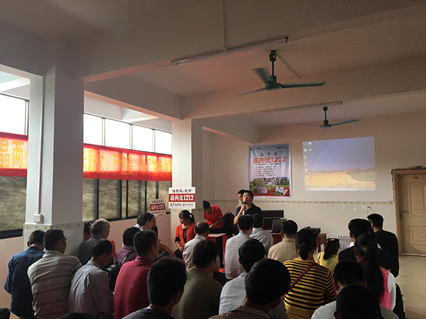 在田間觀摩完后,大家回到會場,由廣西大區(qū)經(jīng)理楊炳對公司、品種等內(nèi)容進行逐一介紹。并重點介紹了今年的強勢品種晶兩優(yōu)1212,除了超抗倒超穩(wěn)產(chǎn)外,晶兩優(yōu)1212米質優(yōu),米廠都是加價收購,在座的零售商結合在田間的所見所聞紛紛贊不絕口。