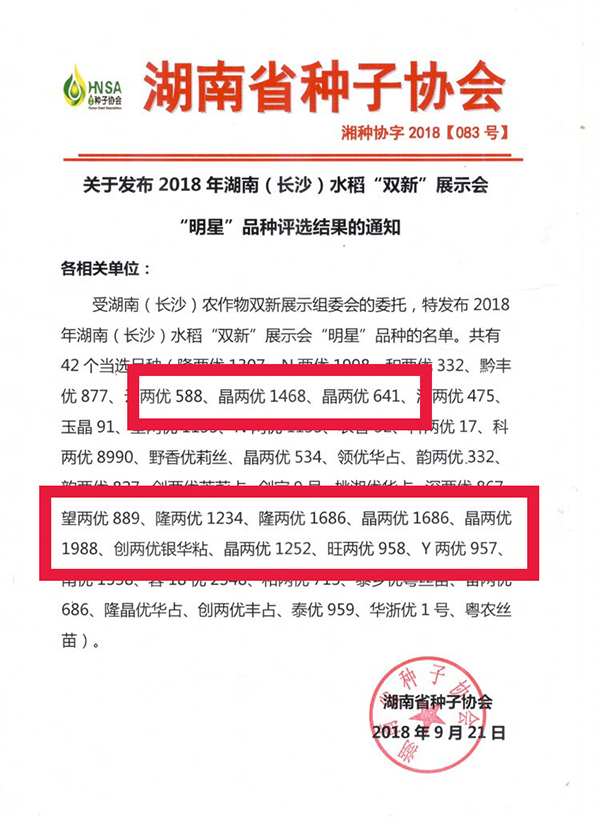晶兩優(yōu)1468:中下游中秈國審品種、華南晚秈即將國審;熟期適宜;豐產(chǎn)、穩(wěn)產(chǎn)性好;抗倒性好、適宜直播、機插、再生稻;國標(biāo)二級優(yōu)質(zhì)稻、湖南湘米工程高檔優(yōu)質(zhì)中稻品種。