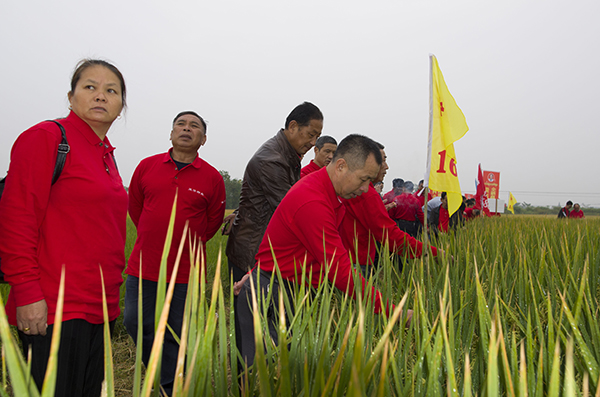 10日上午8時(shí)整,觀摩團(tuán)準(zhǔn)時(shí)乘坐大巴出發(fā)至樂(lè)港鎮(zhèn)丁家村隆兩優(yōu)1686示范田中,目睹隆兩優(yōu)1686的田間風(fēng)采和卓越的表現(xiàn)。下車后,彩旗飄搖迎來(lái)客,紅毯大道通幽徑,映入眼前一抹綠,喜笑顏開獲至寶。隆兩優(yōu)1686憑借優(yōu)異的表現(xiàn),株型緊湊、分蘗強(qiáng);穗大粒多、千粒重;高產(chǎn)穩(wěn)產(chǎn)、保豐收,收獲滿堂喝彩并獲得觀摩經(jīng)銷商朋友的一致認(rèn)可,也更加堅(jiān)定了信心和推廣前景。
