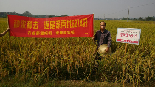 據(jù)了解,2014年,鄧東勝種植水稻5000畝,2010年被評為“全國勞動模范”稱號、2012年當選湖南省人大代表。據(jù)鄧東勝介紹,以前全部種的是常規(guī)稻,2012年開始觀察深兩優(yōu)5814,通過觀察發(fā)現(xiàn),深兩優(yōu)5814抗倒、高產(chǎn)穩(wěn)產(chǎn)、好管理,比較適合大戶種植。2014年試種360畝,實收后平均得干谷671公斤∕畝,高產(chǎn)田達到800公斤∕畝,低的也有550公斤∕畝。