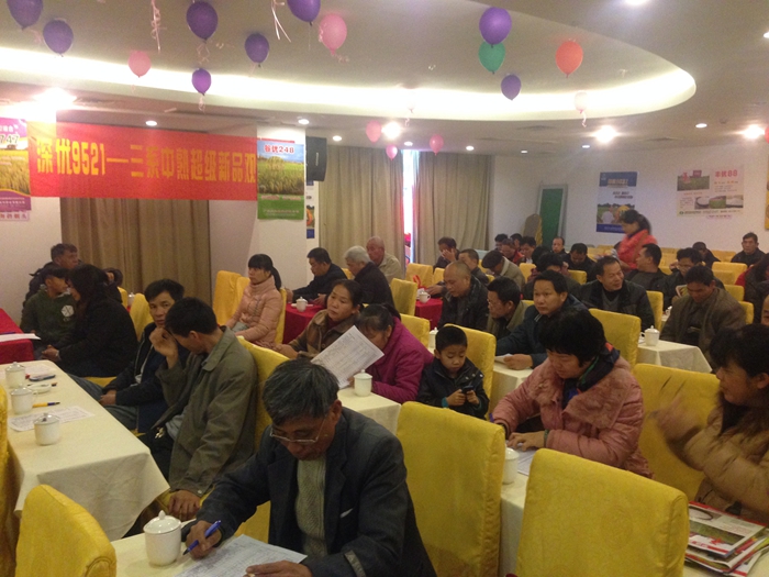 與會的亞華種子廣東分公司副總經(jīng)理曹攀峰對今年早造市場形勢進行分析,并帶來了公司強勢的早造新品種——深優(yōu)9521﹙粵審稻2013038﹚。該品種為感溫型三系雜交稻組合,早造平均全生育期在懷集大約為125—128天,科高100厘米左右,株形適中,分蘗力較強,結(jié)實率高,米質(zhì)鑒定為國標優(yōu)質(zhì)2級和廣東省標優(yōu)質(zhì)3級,生長清秀,后期熟色好,抗倒力強,中抗白葉枯病??梢哉f是廣大零售商們非常歡迎的早造品種。大家聽了曹經(jīng)理的介紹,又通過視頻和照片觀看了廣東各縣深優(yōu)9521的表現(xiàn)情況,喜出望外,紛紛表示“大品牌好品種,值得信賴”,“今年早造又有好品種賣了”,“這好品種我要主推”……