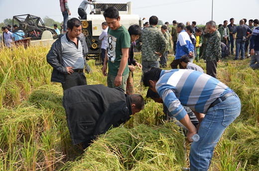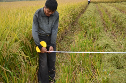 2014年10月29日,江西樂(lè)平代理商華長(zhǎng)雪邀請(qǐng)樂(lè)平3名高級(jí)農(nóng)藝師并組織150人零售商及種田大戶開(kāi)展了隆兩優(yōu)華占現(xiàn)場(chǎng)測(cè)產(chǎn)會(huì)。測(cè)產(chǎn)過(guò)程十分嚴(yán)謹(jǐn),3名經(jīng)銷商手持GPS測(cè)量?jī)x一遍又一遍的測(cè)量收割田塊面積;為了更具準(zhǔn)確性,3名高級(jí)農(nóng)藝師拿出布尺進(jìn)行測(cè)量,最終測(cè)量結(jié)果為:實(shí)割0.9畝地,產(chǎn)濕谷為1671斤,折合后畝產(chǎn)1857斤。
