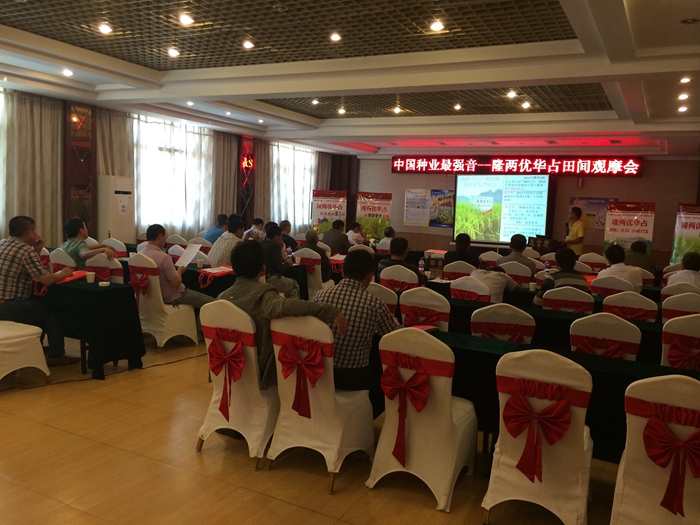 代理商在介紹“隆兩優(yōu)華占”的示范情況和品種的優(yōu)勢