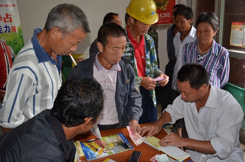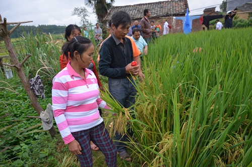 2014年9月19日,早晨8點40分,天下起了小雨。七琴鎮(zhèn)的種子零售商洪海平略帶擔(dān)心地看了看手機上的時間,離約好去田間觀摩中國龍稻—隆兩優(yōu)華占只剩半個小時了,卻只到了不到10人。雨卻是越下越大。突然,一陣陣摩托車的轟鳴聲由遠(yuǎn)及近,洪老板的臉上也露出了笑容,正是農(nóng)民朋友們冒著雨一個接一個地抵達集合點,隨后拿著領(lǐng)取到的宣傳資料笑著交談著,等待著出發(fā)。