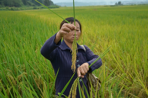 接著,眾人一起來到了第二處的一晚田塊,此時此地,籽黃葉綠,映入眼簾的是滿滿的沉甸甸的稻穗,大家紛紛忍不住下到田間,用手去掂量稻穗、去數(shù)谷子的粒數(shù)、去估算產(chǎn)量,隨后傳出的是一聲聲的驚嘆:“竟然有400多粒!”,“估摸著至少1700斤以上!”,“這兜有32根!”……