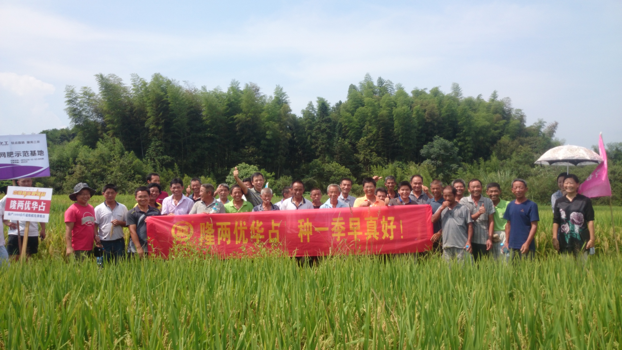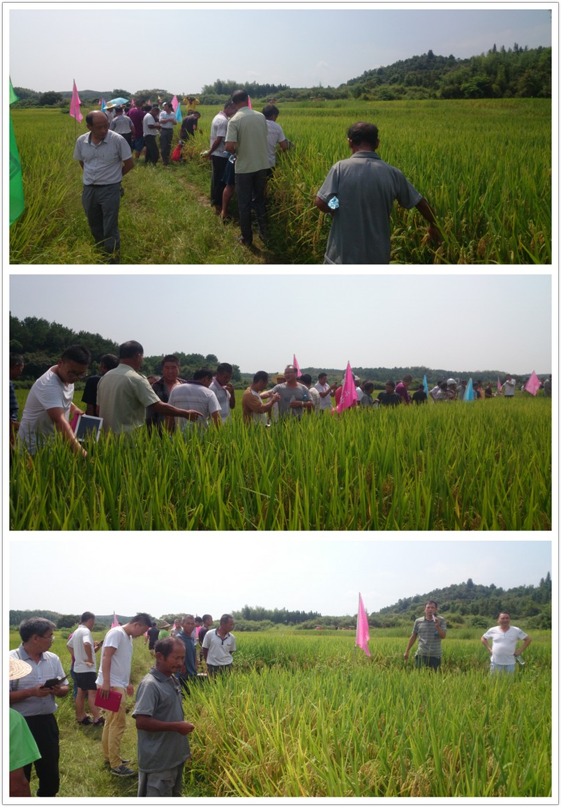 觀摩會現(xiàn)場有白陂鄉(xiāng)、巴山鎮(zhèn)、河上鎮(zhèn)、桃源鄉(xiāng)、許坊鄉(xiāng)等鄉(xiāng)鎮(zhèn)的零售商和種田大戶共60余人,該田塊由石莊鄉(xiāng)詹家村農(nóng)戶洪勁松(13979443489)種植,由于田塊表現(xiàn)突出,六國肥料公司也選取該田塊為觀摩會場。一到現(xiàn)場,不少種田大戶就下到田里,數(shù)分蘗,看稻穗數(shù)粒數(shù),場面十分火爆,盡管烈日高照,汗水浸濕了衣服,很多大戶還是耐心、細(xì)心的聽取亞華種業(yè)江西分公司李克寬經(jīng)理對隆兩優(yōu)華占的介紹,這表現(xiàn)出農(nóng)民是多么期待獲得隆兩優(yōu)華占這樣一個好品種。這期間,一位大戶說道:“你們都是王婆賣瓜,自賣自夸,種這么好的田到底是你們的種子好還是他們的肥料好?”惹的大家都笑起來。李經(jīng)理笑著回應(yīng)到:“現(xiàn)在都流行強(qiáng)強(qiáng)聯(lián)合,俗話都說,好馬配好鞍,只有品種好了,再以好肥料輔佐,那就有更高的收益,這才是你們農(nóng)戶選擇我們的初衷嘛。”