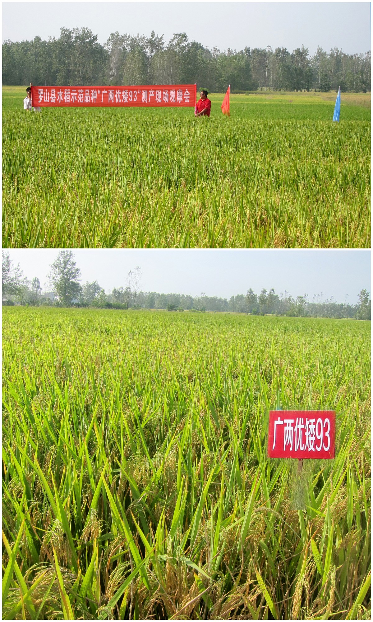 本次還觀摩了另一個國審稻品種——廣兩優(yōu)矮93。廣兩優(yōu)矮93生育期較短,適宜麥茬和油菜茬。本次觀摩的是油菜茬,一眼望去,田間都是稻穗,株型緊湊、株高較矮、結(jié)實(shí)率高,看了的人都說俏巴的很。因播種時間存在差別,本次并未對廣兩優(yōu)矮93進(jìn)行實(shí)地測產(chǎn)。此次觀摩的廣兩優(yōu)矮93的田間表現(xiàn)和深兩優(yōu)5183不分伯仲,同樣受到經(jīng)銷商及大戶的青睞!是值得推廣的好品種!