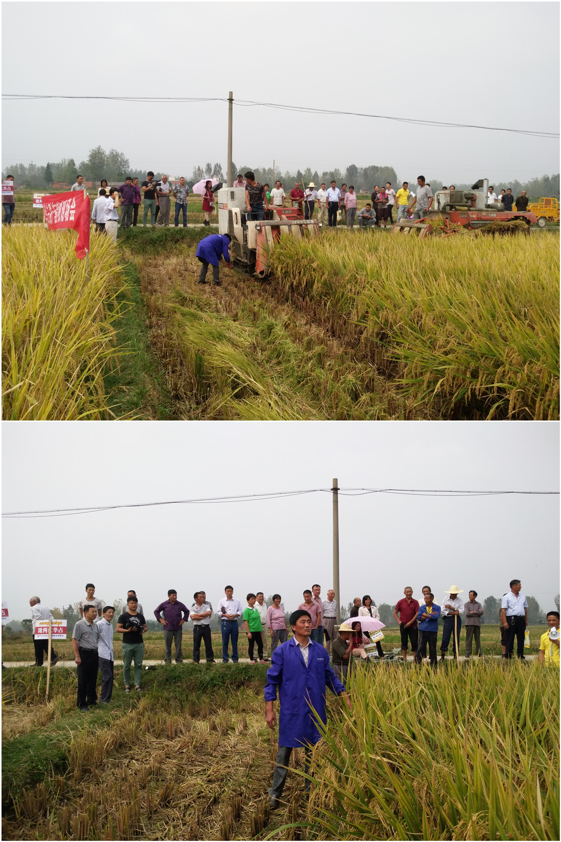 2015年9月19日,40位零售商齊赴郭陸灘鎮(zhèn)圈堰村致富農(nóng)場,他們需要在田間考察隆兩優(yōu)華占的種植表現(xiàn),見證現(xiàn)場收割的產(chǎn)量。該田由種田大戶——周志富(15037686538) 4月12日播種,面積30畝,按照大戶栽培模式管理。經(jīng)過了8月27日的龍卷風肆虐,已過了成熟期,依然笑立田間,展示著豐收的風采。