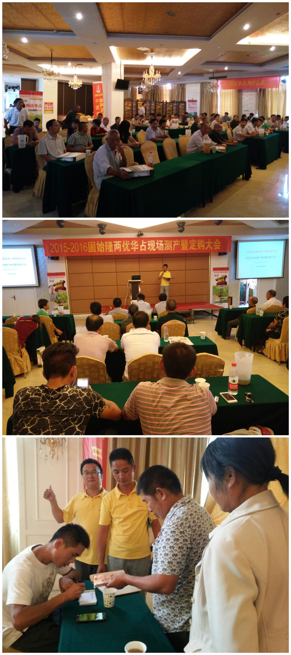 亞華種業(yè)劉松經(jīng)理在國賓大酒店的會場強調隆兩優(yōu)華占堅決貫徹預定銷售模式,不預定、不銷售,公司全力將隆兩優(yōu)華占打造成為大、強、靚的精品大組合!固始縣隆兩優(yōu)華占代理商——石永軍對各鄉(xiāng)鎮(zhèn)高產(chǎn)競賽的實際測產(chǎn)情況及預定銷售獎勵政策進行了公布:草廟鄉(xiāng)呂崗村新圩組——范讀學,畝產(chǎn)1796斤;徐集鄉(xiāng)文塔村東廠組——程家平,畝產(chǎn)1737斤;蔣集鎮(zhèn)余橋村王莊組——曾健,畝產(chǎn)1530斤;觀堂鄉(xiāng)陳集村徐崗組——熊志全,畝產(chǎn)1653斤……