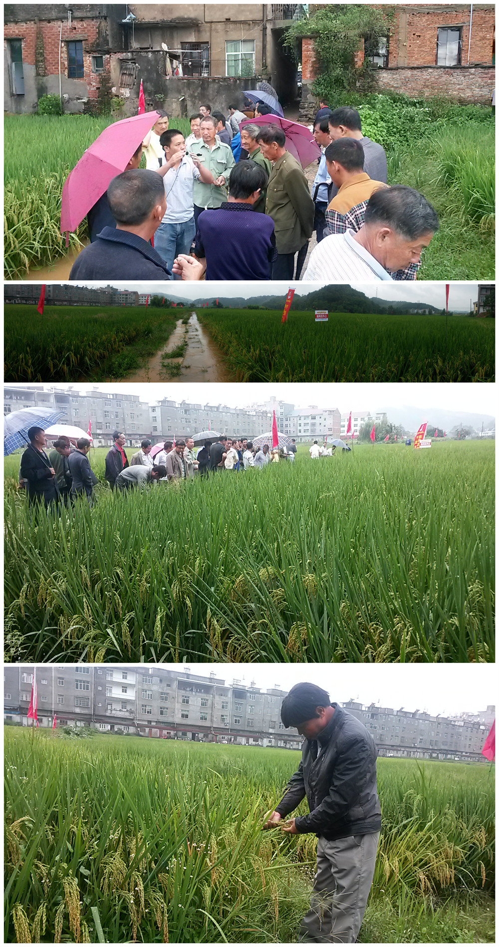 緊接著,由青云鎮(zhèn)零售商李春山帶隊帶領(lǐng)大家來到今天要觀看的隆兩優(yōu)華占示范田中。雖然大雨淹沒了道路,但依然無法阻止大家觀看的腳步。來到田間,大家被眼前彎下的稻穗給深深地吸引了,有些零售商隨便抓了一蔸,嘖嘖地說道“這發(fā)蔸力真強,穗子又多,產(chǎn)量一定很高”。也有種植了二晚的大戶說道:“我的二晚就目前田間表現(xiàn)比這塊田還要好,我自己用手親自去量了下,穗子比這還長”。