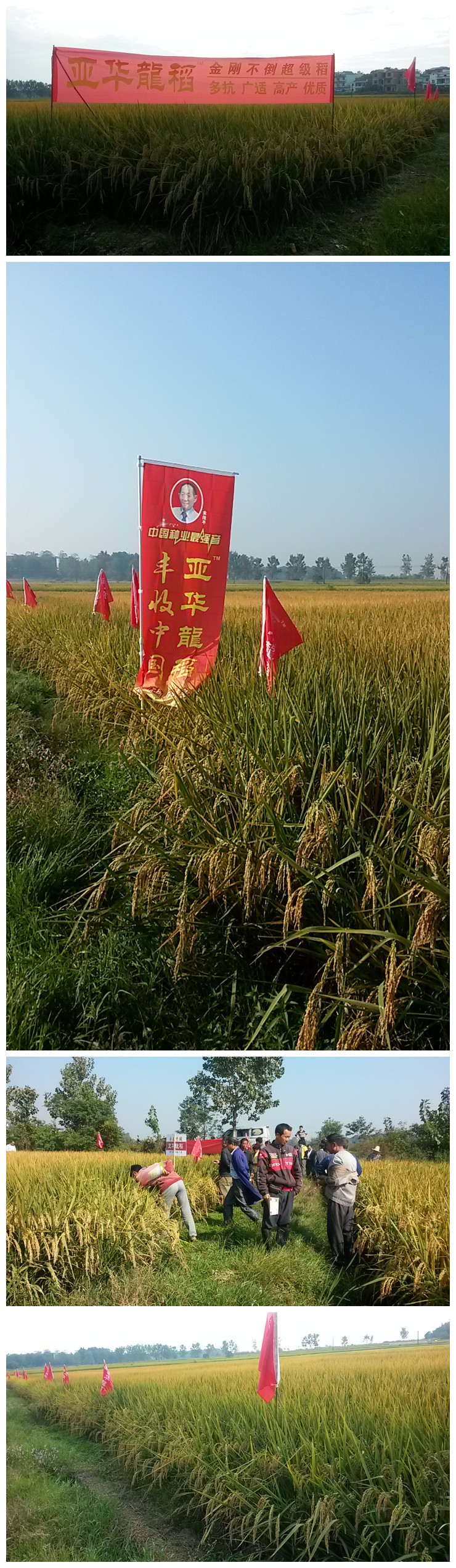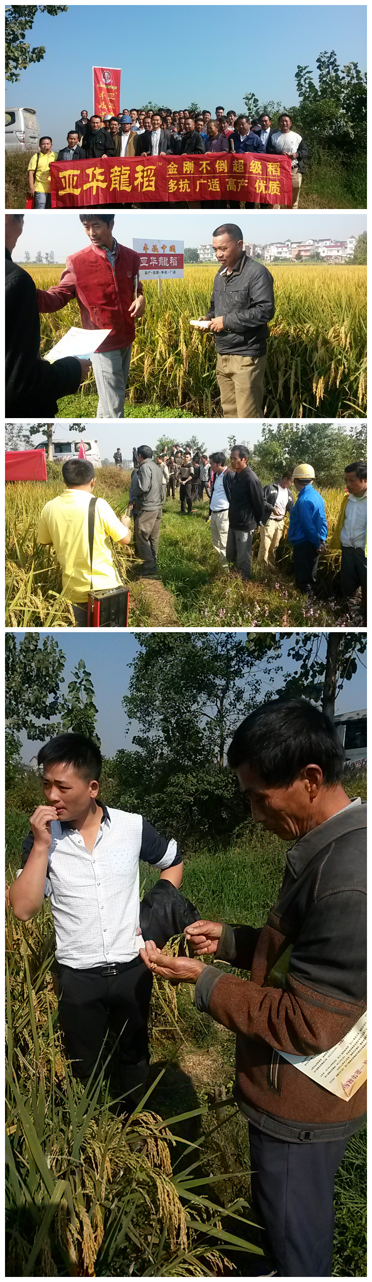 2015年10月15號(hào),在江西萬年縣湖云鄉(xiāng)白馬村,迎面而來的是彩旗飄飄、稻浪滾滾的示范田,就在這番美景之中順利召開了亞華龍稻現(xiàn)場觀摩會(huì)。人們不由自主地下到田邊、田中去近距離地觀看和親近這美景。人們仔細(xì)地觀看后說:“這品種結(jié)實(shí)率真高!到穗頸處的谷粒都是個(gè)個(gè)飽滿”“亞華龍稻的發(fā)蔸能力真強(qiáng),平均有15根,按照這田間表現(xiàn)收割定是大豐收”!