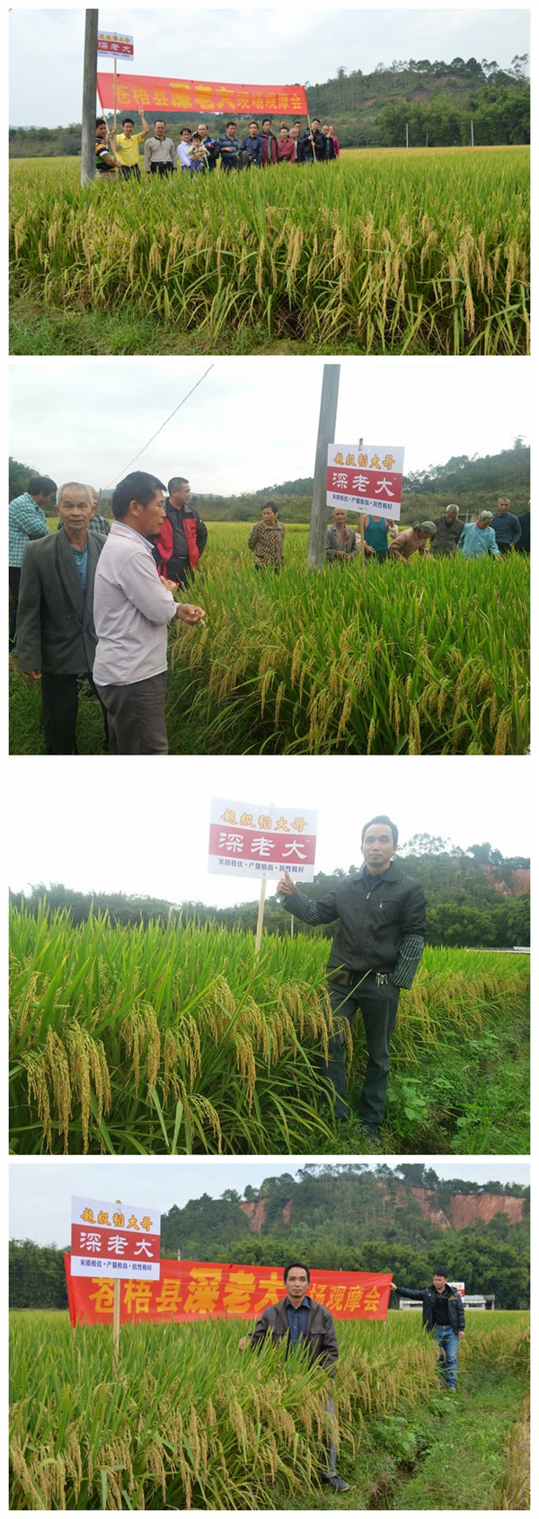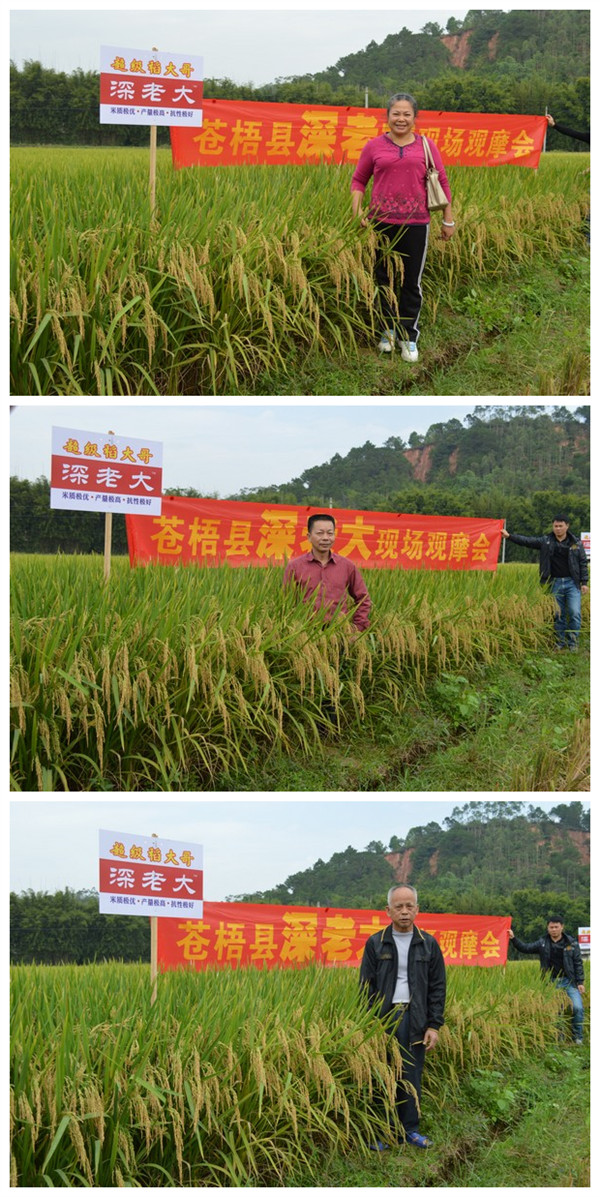 2015年11月15日,來自梧州各個核心鄉(xiāng)鎮(zhèn)零售商,來到民國上將李品仙故居——蒼梧縣新地鎮(zhèn)殿村水口自然村,在田間目睹“深老大”的英姿。剛下車,眼睛就被那葉片清秀的深老大吸引住了,大伙走近田間,藏不住滿臉的歡喜,卻也不忘用挑剔的眼光開始仔細考研,梨埠鎮(zhèn)胡老板、廣平鎮(zhèn)的冀老板同聲說:“分蘗力強、結實率這么高,像這樣特殊的天氣,能長這么好,這品種確實是難得,并且沒有其他病害!”紛紛掏出手機與深老大合影。