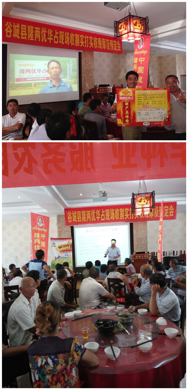測產(chǎn)過后,大家歡聚一堂。亞華種子公司的黃經(jīng)理對田間測產(chǎn)情況作了分析并介紹了隆兩優(yōu)華占的特征特性和在湖北各地近三年的種植表現(xiàn)情況。隨后,代理商張祥友宣布了相關(guān)的預(yù)定政策。大家爭先恐后的交款預(yù)定,把會議氣氛推向了高潮。