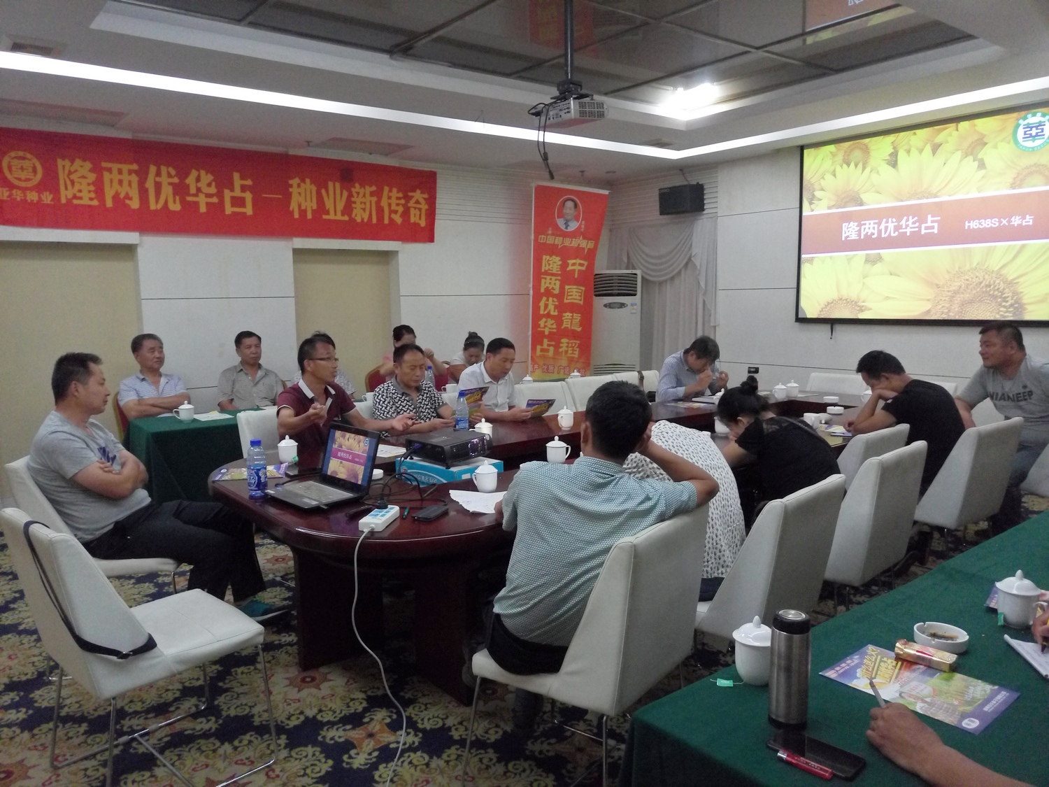 田間觀摩后,來(lái)到會(huì)議室。首先,由湖南亞華種子有限公司黃凱經(jīng)理,給大家介紹公司背景實(shí)力、研究水平和運(yùn)營(yíng)情況,以及隆兩優(yōu)華占特征特性、高產(chǎn)挑戰(zhàn)賽、強(qiáng)調(diào)市場(chǎng)秩序管控。然后,經(jīng)銷(xiāo)商代表?xiàng)钽y才和段方平發(fā)言,分別對(duì)隆兩優(yōu)華占這兩年種植情況做評(píng)價(jià),表示隆兩優(yōu)華占是個(gè)好品種、大品種,在高溫天氣還能有這么高的結(jié)實(shí)率,楊老板還把自己抽樣數(shù)的結(jié)實(shí)率公布給大家,結(jié)實(shí)率為90.0%。