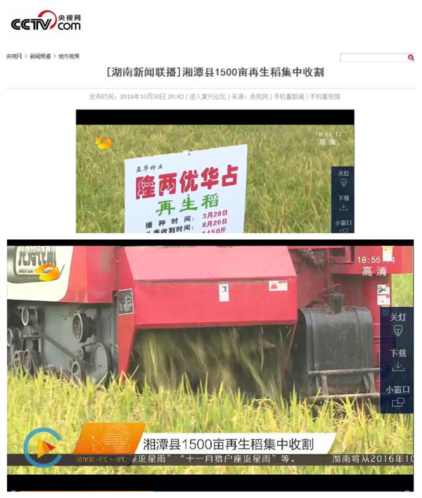 湘潭縣種植大戶馬新泉在白石鎮(zhèn)種植再生稻1500余畝,總共選取了7個品種進行對比試驗,通過兩年來的跟蹤及數(shù)據(jù)收集,隆兩優(yōu)華占的綜合表現(xiàn)最為突出,頭季產(chǎn)量達到1500斤/畝左右。 2016年10月30日,湘潭市電視臺對隆兩優(yōu)華占再生稻測產(chǎn)進行現(xiàn)場采訪報道,產(chǎn)量在400-700斤/畝之間。CCTV,湖南衛(wèi)視等相關媒體對此做了跟蹤報道,視頻請鏈接http://news.cctv.com/2016/10/30/VIDEPxcz7tMtH2wQk56wLy9G161030.shtml