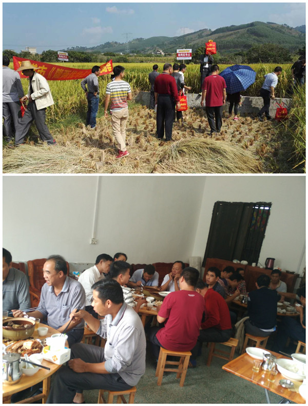 早上八點(diǎn),全體人員集結(jié)完畢,6部汽車帶著我們向石羅前進(jìn)。汽車在美麗的鄉(xiāng)間公路前行,一路的風(fēng)景美如畫,經(jīng)過一個(gè)小時(shí)的行程,我們到達(dá)了此次田間的會(huì)場(chǎng)。我們向著隆兩優(yōu)華占田塊前行,零售商們紛紛走進(jìn)田間,仔細(xì)地觀察隆兩優(yōu)華占田間的表現(xiàn),有的拉著稻穗,看稻穗的長(zhǎng)度并數(shù)粒數(shù),有的扒開稻株觀察病蟲害情況,有的忙著與稻谷合影,有的在田間來回走動(dòng),拿隆兩優(yōu)華占與旁邊的其他品種做對(duì)比。今年晚稻整個(gè)廣西雨季偏多,很多品種得病很嚴(yán)重,特別是稻曲病最為嚴(yán)重,但隆兩優(yōu)華占這邊表現(xiàn)干干凈凈,比旁邊的其他品種表現(xiàn)好很多。大家都稱贊這個(gè)品種抗性真的很好。有位零售商跟我說:這個(gè)隆兩優(yōu)華占相對(duì)其他品種,最大的優(yōu)勢(shì)是豐產(chǎn)性和抗性,我做了三年示范了,年年表現(xiàn)很好。在田間會(huì)場(chǎng),貴港代理商簡(jiǎn)單介紹隆兩優(yōu)華品種特性,以及他經(jīng)過這三年的跟蹤觀察的感受和了解,他認(rèn)為如果目前市場(chǎng)上大力推廣的晶兩優(yōu)和隆兩優(yōu)系列是桂楠晚稻的明星品種,那么隆兩優(yōu)華占就是這兩個(gè)系列品種里最耀眼的明星。