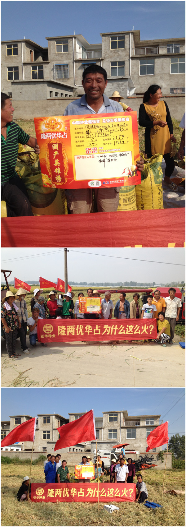 2016年9月24日上午,在南照鎮(zhèn)十里村開始了潁上縣隆兩優(yōu)華占第一場現(xiàn)場測產(chǎn)會,獲得了畝產(chǎn)1792.5斤干谷的較高產(chǎn)量,比相鄰田塊每畝增產(chǎn)高達600斤。按照公司2016年度高產(chǎn)挑戰(zhàn)賽,現(xiàn)場對種植戶楊重道發(fā)放了三等獎獎品。楊重道大哥感慨地說:今年由于受連續(xù)的高溫干旱影響,周邊鄰居的田塊大部分也就1000-1200斤,更有影響嚴(yán)重的田塊只收了幾百斤。我種植的隆兩優(yōu)華占品種今年是真抗高溫,結(jié)實率幾乎未受影響,但是看上去的產(chǎn)量也就在1200斤左右,沒想到能夠收到這么高的產(chǎn)量,估計明年俺們莊上都要種植這個品種了。