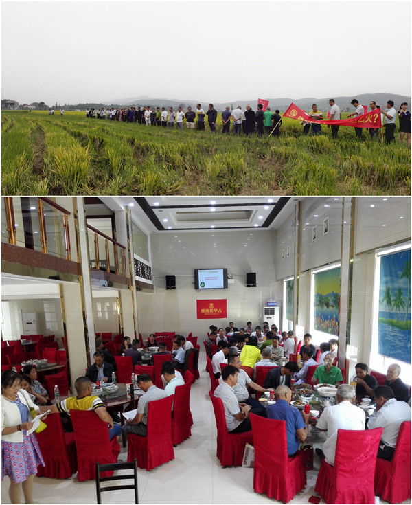 一到田間地頭,代表們就細(xì)看稻田中隆兩優(yōu)華占的結(jié)實(shí)率跟穗形。大田中隆兩優(yōu)華占整體上表現(xiàn)出結(jié)實(shí)率高、成熟后落色好、抗病能力強(qiáng)、株型緊湊等特點(diǎn)。田間觀摩期間,當(dāng)?shù)胤N植戶現(xiàn)場(chǎng)分享隆兩優(yōu)華占種植經(jīng)驗(yàn),從施肥、播種時(shí)期、用種量、田間直播除草、多硝唑控高等方面進(jìn)行講解??吹教镩g隆兩優(yōu)華占的表現(xiàn),大家紛紛估測(cè)產(chǎn)量。田間講解的種植戶李德仁也如實(shí)地將2016年月31日觀摩的隆兩優(yōu)華占實(shí)收產(chǎn)量進(jìn)行公布:高產(chǎn)的畝產(chǎn)達(dá)1892斤濕谷,平均畝產(chǎn)在1720斤濕谷。這樣的產(chǎn)量讓參會(huì)的代表們有些懷疑,因?yàn)樗麄冇X(jué)得今年的氣候能夠達(dá)到這么高的產(chǎn)量可能性不大。但真實(shí)的產(chǎn)量及隆兩優(yōu)華占田間表現(xiàn)又打消了他們的疑慮,連連稱贊這的確是個(gè)好品種,代表們紛紛與隆兩優(yōu)華占合影留念!