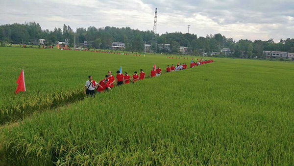 早上8點(diǎn),微風(fēng)吹拂,霞光萬道,全體與會(huì)人員精神抖擻,來到隨州何店鎮(zhèn)示范田間觀摩,示范田分水直播和旱直播兩種模式。此次田間觀摩的主要目的是通過高密度直播檢驗(yàn)其豐產(chǎn)性、抗倒伏性、抗病性、分蘗力、結(jié)實(shí)率以及不同的栽培模式表現(xiàn)優(yōu)勢(shì)等。通過現(xiàn)場(chǎng)觀摩及與示范專家王保民和當(dāng)?shù)剞r(nóng)業(yè)主管部門的技術(shù)專家交流得知:隆兩優(yōu)華占在隨州上市3年來,經(jīng)歷了2016年的“水深火熱”及2017年的長期高溫考驗(yàn),仍舊表現(xiàn)出抗病、高產(chǎn)、分蘗力強(qiáng)、米質(zhì)好、商品性優(yōu)異、結(jié)實(shí)率高等優(yōu)勢(shì),經(jīng)試驗(yàn)還適合機(jī)插、移栽、直播、拋秧等多種栽培模式。其“四國審,秈稻區(qū)域全覆蓋”、“農(nóng)業(yè)部超級(jí)稻”、“全球水稻年度明星品種”等榮譽(yù)實(shí)至名歸。現(xiàn)場(chǎng)嘉賓嘖嘖稱贊:結(jié)實(shí)率高達(dá)86%,沒有紋枯病、沒有稻瘟病、沒有卷葉螟、清秀挺拔,實(shí)在是百年不遇的好品種。同時(shí)壟上頻道全程航拍、《隨州社會(huì)全方位》欄目及《農(nóng)村新報(bào)》在現(xiàn)場(chǎng)采訪荊州、孝感和荊門的客戶將田間觀摩活動(dòng)推向了高潮。