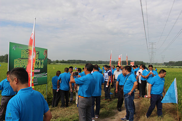 會議伊始,在定遠(yuǎn)縣隆兩優(yōu)1212代理商郭海濤的組織下,全體參會人員乘車前往定遠(yuǎn)縣桑澗鎮(zhèn)觀摩隆兩優(yōu)1212的示范田。由朱經(jīng)理向大家介紹了隆兩優(yōu)1212示范田的播種、移栽、齊穗時(shí)期和施肥等情況,也得到了經(jīng)銷商們的一致好評。