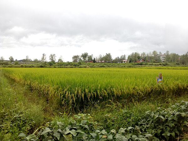 8點半左右在聶老板帶領下,大家來到萬店示范田塊觀摩。葉青籽黃是大家看到示范田塊的第一印象!該示范田播種在四月中下旬,全程高溫抽穗、揚花,結實率可達90%,田間清秀、株型挺拔、緊湊。
