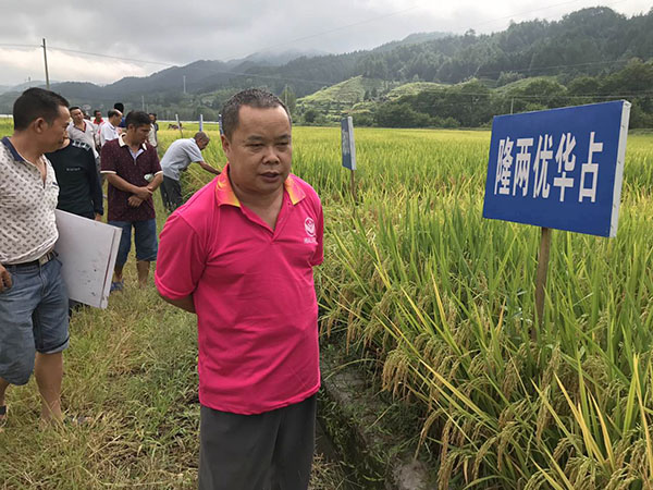 2017年8月30日上午,新晃縣亞華種業(yè)代理商吳克云在扶羅鎮(zhèn)組織了隆兩優(yōu)華占觀摩會,前來觀摩的有農(nóng)業(yè)局領(lǐng)導(dǎo)、亞華種業(yè)婁懷區(qū)域經(jīng)理何少海、鄉(xiāng)鎮(zhèn)種子零售商及種田大戶。當(dāng)日烏云密布,但絲毫沒有影響大家的熱情。看著插有隆兩優(yōu)華占示范牌的田塊,所有人的目光都被它又長又多的穗子吸引,種植戶得意地說,“從來沒有種過產(chǎn)量這么高的,今年是選對種了,這2畝田少說要收3000斤谷”。