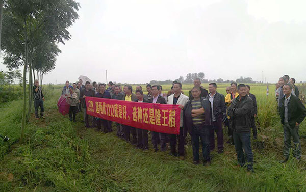 上午10點(diǎn)整,雖然下起了大雨,但在種植戶(hù)們強(qiáng)烈要求下,一行70人冒雨前往田間觀摩!種植大戶(hù)們紛紛稱(chēng)贊隆兩優(yōu)1212株葉形態(tài)好、葉青籽黃、結(jié)實(shí)率高!并一同高舉“隆兩優(yōu)1212就是好,選種還是隆王稻”橫幅合影。