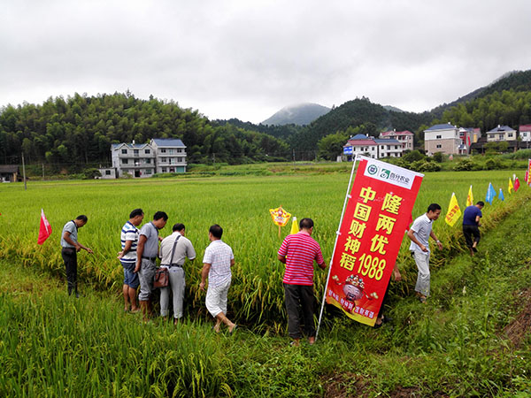 2017年9月11日上午,呼吸著雨后清新的空氣,德興市繞二鎮(zhèn)江灣村,一塊彩旗飄飄的田埂上人來人往,好不熱鬧,究其因,原來是財(cái)神稻又在展現(xiàn)她的傲人風(fēng)采。