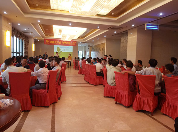 田間觀摩后,11點(diǎn)10分大家來(lái)到了位于山南片區(qū)的強(qiáng)力大酒店,由亞華種業(yè)安徽分公司黃明燈經(jīng)理講解了水稻的直播、移栽、機(jī)插秧等技術(shù)要領(lǐng)及需要注意的一些事項(xiàng)。特別是隆兩優(yōu)華占的耐肥度相當(dāng)?shù)母?,一定要多施?fù)合肥,適當(dāng)使用氮肥。重點(diǎn)提醒大戶一定要舍得前期投入,才能有后期高產(chǎn)的回報(bào)。通過(guò)列舉霍邱區(qū)域今年測(cè)產(chǎn)的事例,著重強(qiáng)調(diào)一定要看田間的整體分蘗力,而不是單單看田邊的一小塊水稻的分蘗力。在抗病性方面,隆兩優(yōu)華占抗稻瘟指數(shù)能達(dá)到1.4,因此不需要花太多的精力去管理這些常見(jiàn)的水稻病害,在防治稻曲病時(shí),需要在水稻破口前打藥,盡量不要施農(nóng)家肥,后期減少氮肥的使用量。