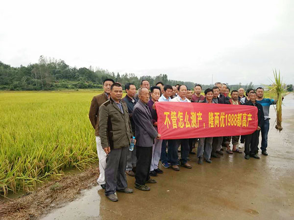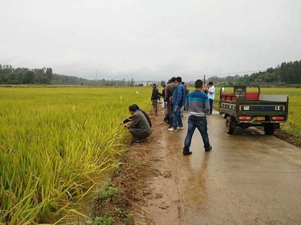 2017年9月9日星期天,在湖北棗陽市清潭鎮(zhèn)迎來了襄陽隆兩優(yōu)1988代理邵總所組織的30多人的觀摩團,盡管田間“水漫金山”依然不能阻擋來自襄陽零售商及種植大戶的觀摩熱情。
