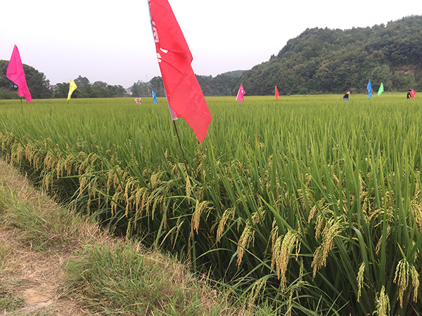 隆兩優(yōu)華占欲問(wèn)鼎天下,試問(wèn)誰(shuí)與爭(zhēng)鋒。2017年9月20日,早晨9點(diǎn),萬(wàn)年縣幾十名零售商和種田大戶歡聚一堂,只欲再睹華占之風(fēng)采。田間彩旗飄飄,金黃稻穗與田邊樹葉相互交映,宛如仙境。